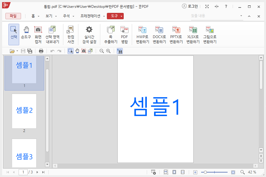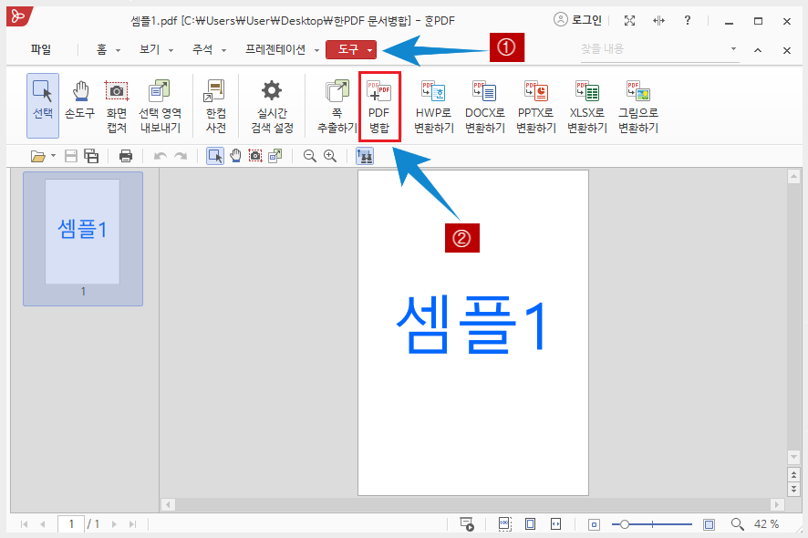 메뉴바의 <도구>를 클릭한 후 하단 리본 메뉴의 <PDF 병합>을 클릭하면 PDF 병합 대화상자가 나옵니다.