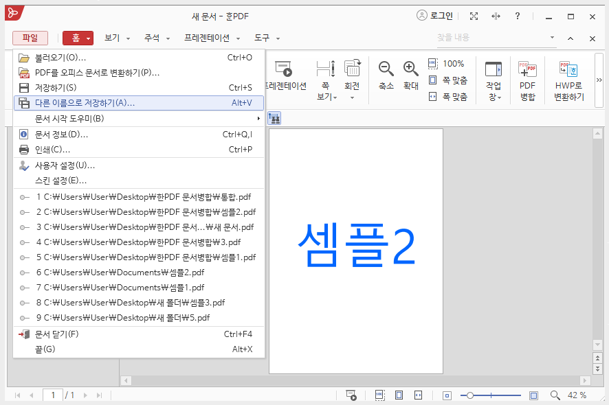 이렇게 하나로 합쳐진 문서는 마지막으로 메뉴바의 <파일>을 클릭한 후 다른 이름으로 저장하여 주세요. 그러면 PDF 문서 합치기가 완료하게 됩니다.