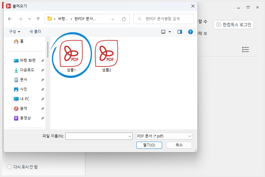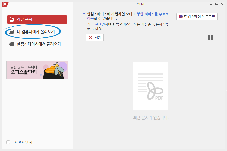 한PDF를 실행 후 <내 컴퓨터에서 불러오기>를 클릭하여 줍니다.