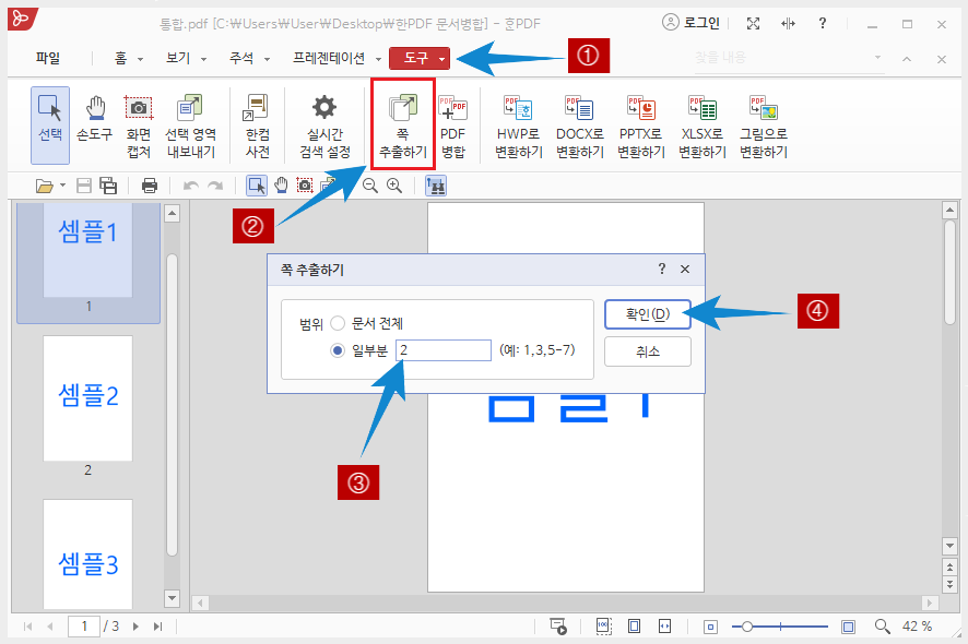 <도구> 메뉴를 클릭하여 <쪽 추출하기>를 클릭하여 주고 <일부분 탭에 추출할 문서의 페이지 수를 기입>하고 <확인>을 클릭하여 줍니다. 추출할 셈플2 문서는 2페이지이므로 2라고 적으면 되겠지요.