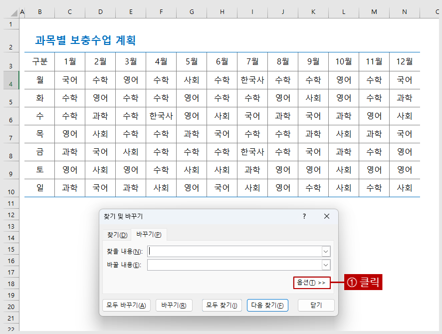 1월부터 6월까지의 보충수업 계획에서 국어를 모두 수학으로 바꿔야 한다면 셀마다 입력된 과목을 하나하나 확인하여 바꿔야겠지요. <찾기 및 바꾸기> 대화상자를 이용하면 그럴 필요가 없습니다.