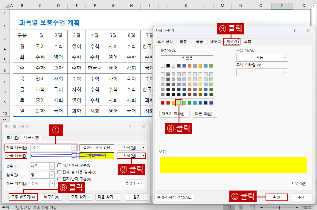 <찾을 내용>에 국어를 입력 후 <바꿀 내용>의 <서식>을 클릭합니다. 그리고 서식 바꾸기 대화상자가 나오면 <채우기> 탭을 클릭하고 노란색 선택 후 <확인>을 클릭합니다. 마지막으로 찾기 및 바꾸기 대화상자로 돌아와 <모두 바꾸기>를 클릭하여 주세요.