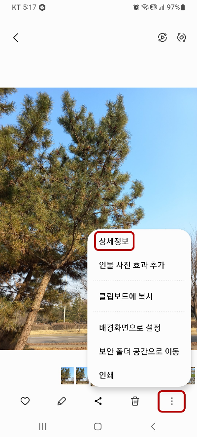 그리고 갤러리 앱에 가서 카톡에서 다운로드한 이미지를 선택 후 왼쪽 하단에 있는 [점 세 개] - [상세정보]를 누르면 사진파일의 확장자가 JPG인 것을 확인할 수 있습니다.