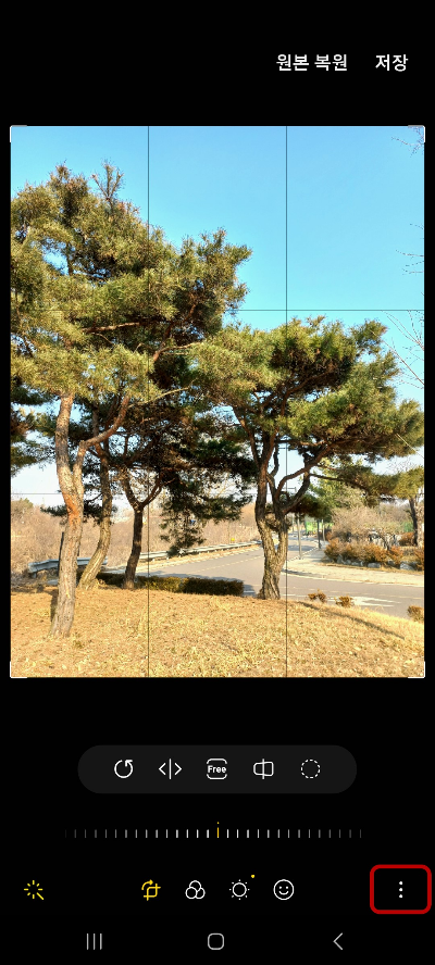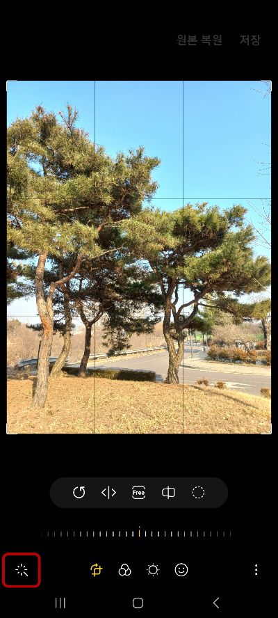 자동보정 버튼을 누르면 색감, 밝기, 대비, 사진 크기등이 자동으로 보정이 됩니다. 해당버튼의 위치는 안드로이드 OS버전에 따라 다른데 편집화면 왼쪽상단에 위치하기도 왼쪽 하단에 위치하기도 합니다.