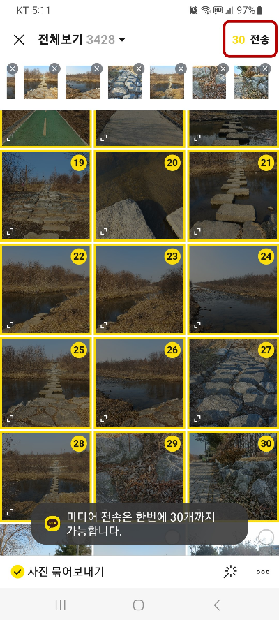 전체를 누르면 사진 <전체보기> 창이 열리면서 왼쪽 하단에 <사진 묶어 보내기> 메뉴가 보이는데 이것을 선택해 체크해 주세요. 사진 묶어 보내기를 이용하면 한 번에 30장의 사진을 보낼 수 있습니다.