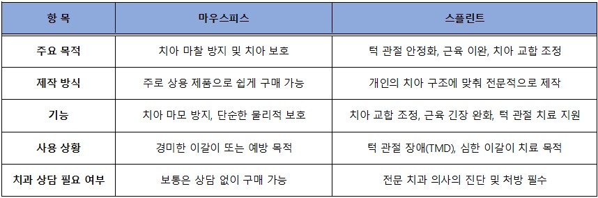 이갈이로 고통받는 사람들에게 마우스피스와 스플린트는 치아와 턱 관절을 보호하는 중요한 도구이지만, 그 기능과 목적에서 뚜렷한 차이가 있습니다. 마우스피스는 주로 가벼운 이갈이 증상에 대응하며, 치아 마찰을 최소화하고 기본적인 보호 기능을 제공합니다.