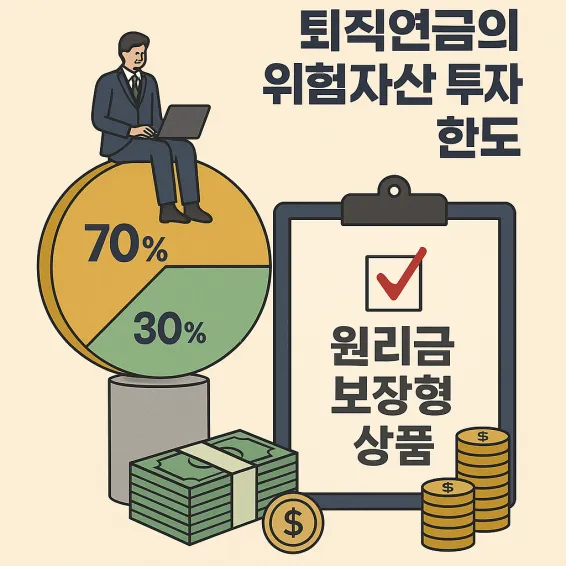 퇴직연금은 안정적인 노후 자산을 형성하는 것을 목표로 하며, 이에 따라 투자 가능 자산에 대한 엄격한 규제가 적용됩니다. 현재 퇴직연금의 위험자산 투자 한도는 총 적립금의 70%로 제한되어 있어, 나머지 30%는 원리금 보장형 상품에 투자해야 합니다.