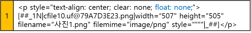 대표 이미지가 있는 코드를 찾으셨으면 1번 코드의 float: none; 뒤에 2번처럼 display:none; 입력 후 HTML 체크를 해제하고 글쓰기 창으로 돌아가 보면 본문에서 썸네일 이미지가 사라진 것을 확인하실 수 있습니다.