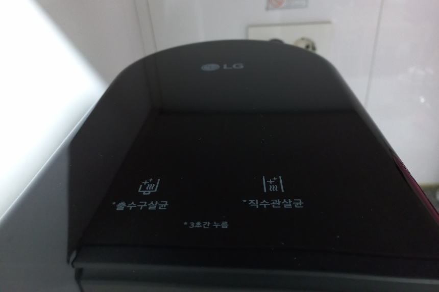 요즘 정수기는 물통이 없는 스테인리스 직수관을 사용합니다. 스테인리스 관이라도 위생을 위해 주기적으로 청소를 해줄 필요가 있겠지요. 똑똑하게도 주 1회 자동으로 고온 살균으로 직수관을 청소해 주고, 추가로 살균을 원하면 상단에 있는 직수 살균 버튼을 누르면 됩니다.