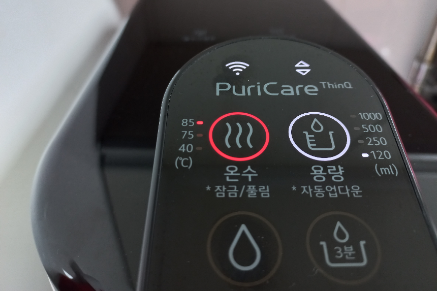 온수 온도의 경우 타사 제품은 100 ℃까지 설정할 수가 있는데 40, 75, 85 ℃ 3단계만 선택할 수 있는 게 좀 아쉽습니다. 개인적인 생각이지만 컵라면이나 커피는 아주 뜨거운 물로 해서 먹는 것이 더 맛이 있더라고요.