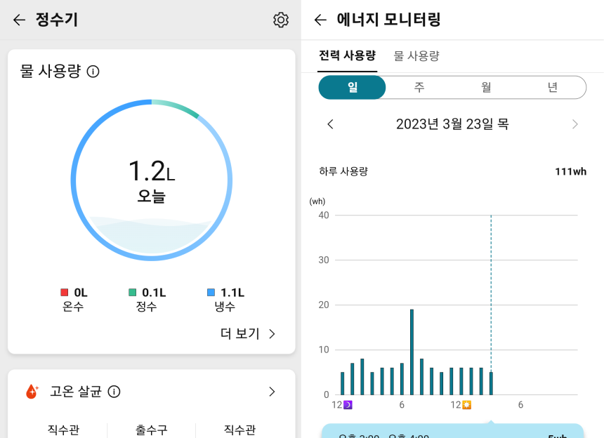 LG ThinQ 앱으로 정수기와 스마트폰을 연결하면 오늘 먹은 물과 전기 사용량을 확인할 수 있고 직수관 살균 및 기본 출수 등을 설정할 수가 있습니다.