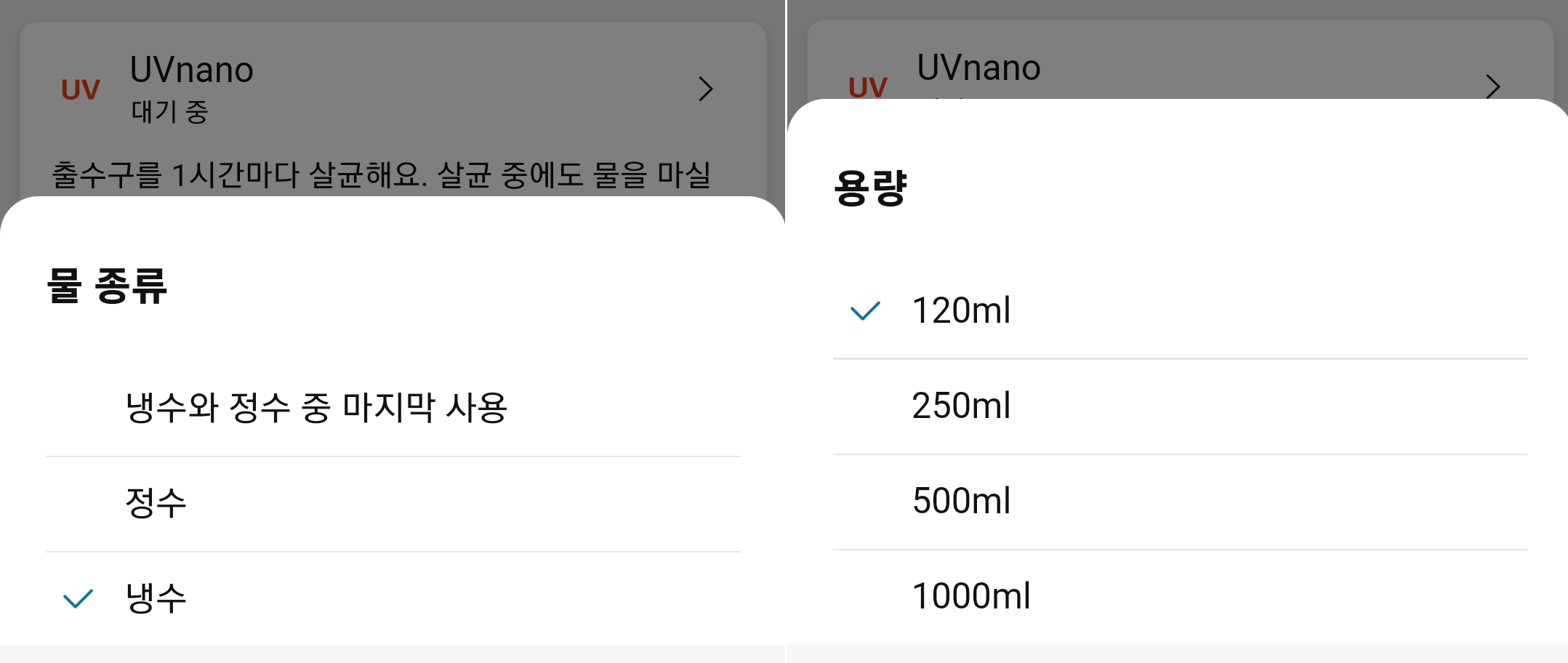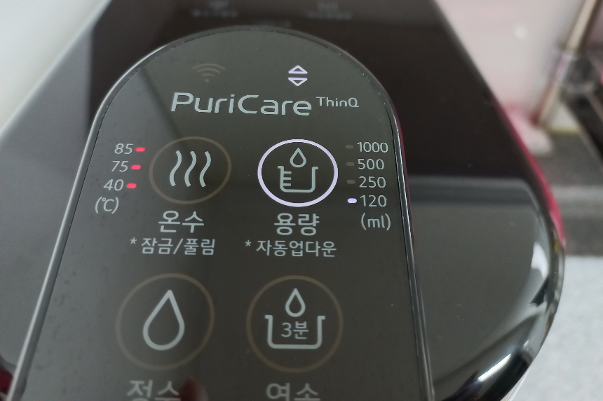 저희 집 아이들은 겨울에도 냉수를 마시는데 기본 세팅이 냉수와 정수 중 마지막으로 사용한 모드로 되어 있어 정수 사용 후 시원한 물을 먹으려면 냉수 버튼을 눌러 변경해야 하는데 그냥 물을 받는 경우가 많습니다. 그러다 보니 미지근한 정수 물이 나오면 버리고 냉수물을 다시 받아먹곤 합니다. 기본 세팅을 냉수와 종이컵 한 잔 용량인 120ml로 설정해 놓으니 사용할 때마다 모드 변경을 할 필요가 없어 참 편합니다.