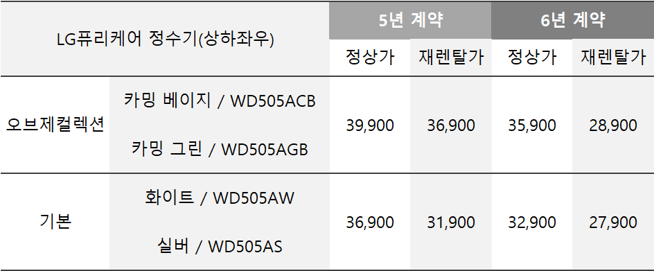 렌탈 요금을 보면 오브제 컬렉션이 기본 모델보다 조금 더 비싼데 이유는 도색비용이 더 들어가기 때문이라고 하네요. 화이트와 실버보다는 카밍 베이지와 카밍 그린이 더 고급스러워 보이지만 성능의 차이가 없기 때문에 좀 더 저렴한 화이트 색상의 WD505AW 모델을 선택하였습니다.