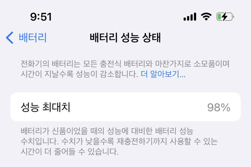 아이폰의 경우 배터리가 신품이었을 때 대비 현재의 배터리 성능을 확인할 수가 있는데 제가 구매한 아이폰 13은 98%로 배터리 성능은 최상입니다.