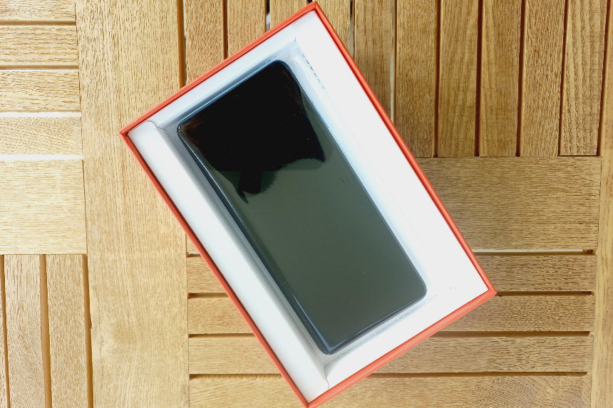 박스 안에 있는 구성품을 모두 꺼내 보았습니다. 스마트폰 외에 충전기, 보호필름, 투명 케이스, 유심 핀, 설명서가 있습니다.