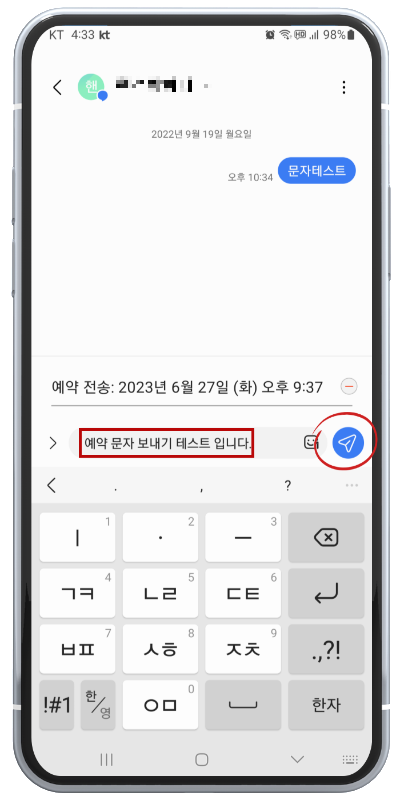 예약 전송 시간을 설정하고 완료를 누르면 화면 중간에 설정한 예약 전송시간이 표시가 됩니다.