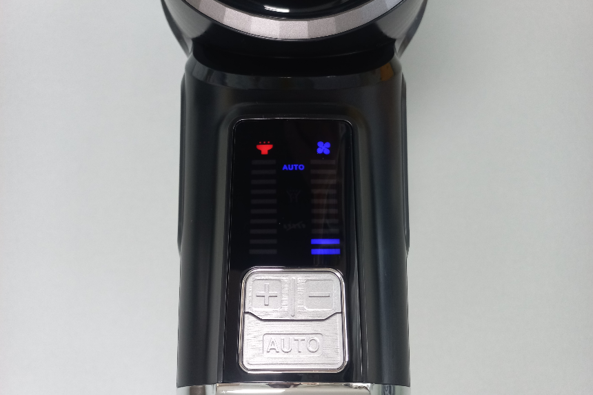 먼지를 빨아들이는 흡입력은 수동으로 1단계에서 5단계까지 조절할 수 있지만 AUTO 버튼을 누르면 먼지양에 따라 흡입력이 자동 조절되어 배터리 소모를 줄일 수 있는데 이 기능은 정말 좋은 것 같습니다.