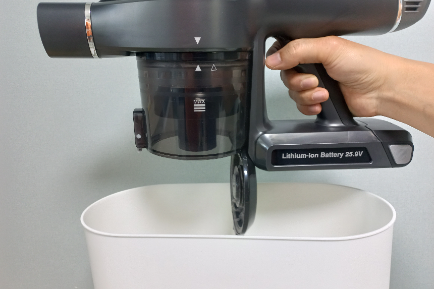 먼지통은 원터치 버튼형 구조로 되어있어서 버튼만 누르면 먼지통 덮개가 열려 바로 내용물을 쓰레기통에 버릴 수 있는데요. 먼지통 비우는 것이 쉽고 간편한 게 너무 좋습니다.