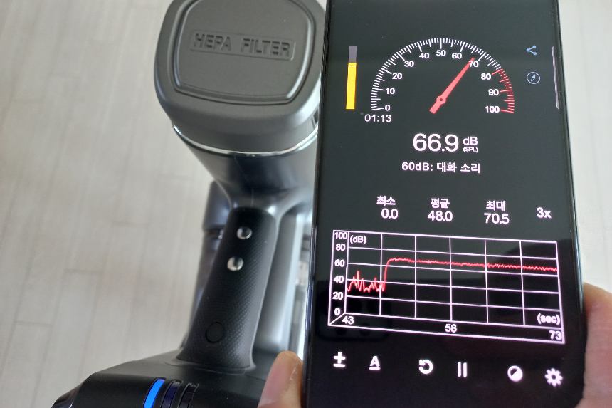흡입 세기 단계에 따라 소음은 달라지지만 1단계에서 소음 67데시벨, 2단계 70데시벨로 크지 않습니다. 최대 출력인 5단계에서는 74데시벨 소음이 좀 있는 편이지만 1, 2단계로 충분히 청소가 가능하기 때문에 5단계로는 잘 사용 안 할듯합니다.