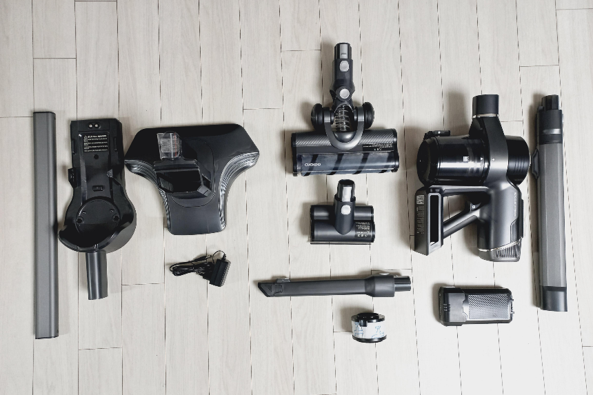 구성품은 거치대(거치대 연결관, 충전대, 충전 받침대, 고정나사 2개 포함), 융 브러시, 침구 브러시, 틈새 흡입구, 본체(배기필터, 프리필터, 금속망 필터 포함), 배터리, 길이조절 연결관, 충전 어댑터이고 프리필터는 본체에 장착된 것 외에 교체용으로 1개가 더 들어 있네요.