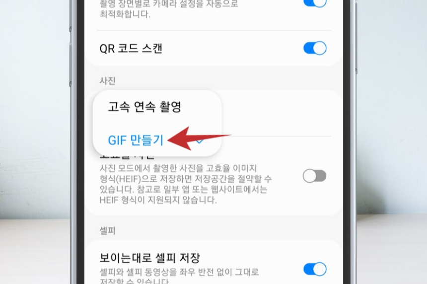 그러면 다음과 같이 고속 연속 촬영, GIF 만들기가 나오는데 여기서 GIF 만들기를 선택합니다. 그리고 카메라 설정 화면 밖으로 나옵니다.