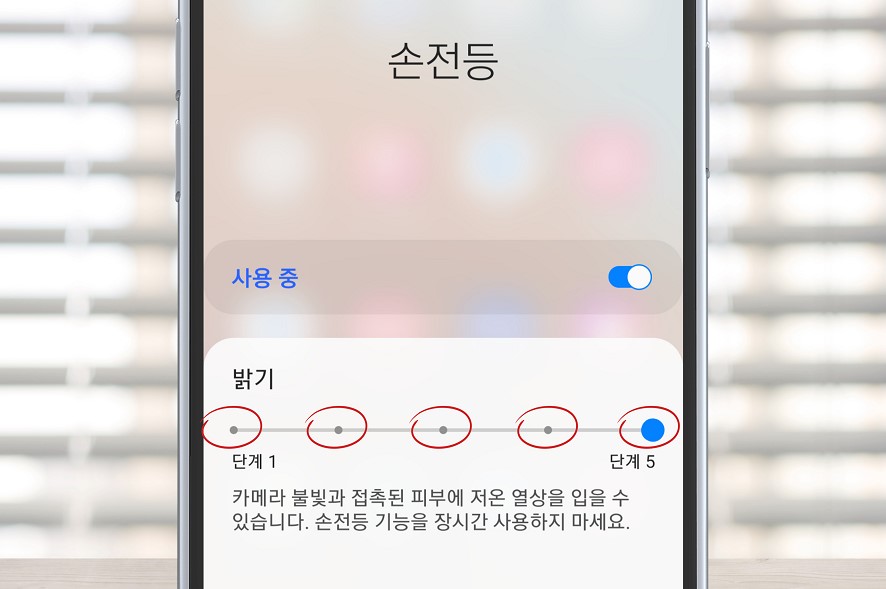 이번 시간에는 스마트폰 손전등 밝기 조절하는 방법에 대해 알아보았습니다. 스마트폰 손전등은 3단계 밝기로 기본 설정이 되어 있습니다. 더 밝게 보려면 4단계, 5단계로 설정해 주시면 됩니다. 밝기 4단계부터는 카메라 불빛에 피부가 오래 접촉이 되면 저온 열상을 입을 수 있다는 경고 문구가 나오니 손전등 사용에 주의하여 주세요.
