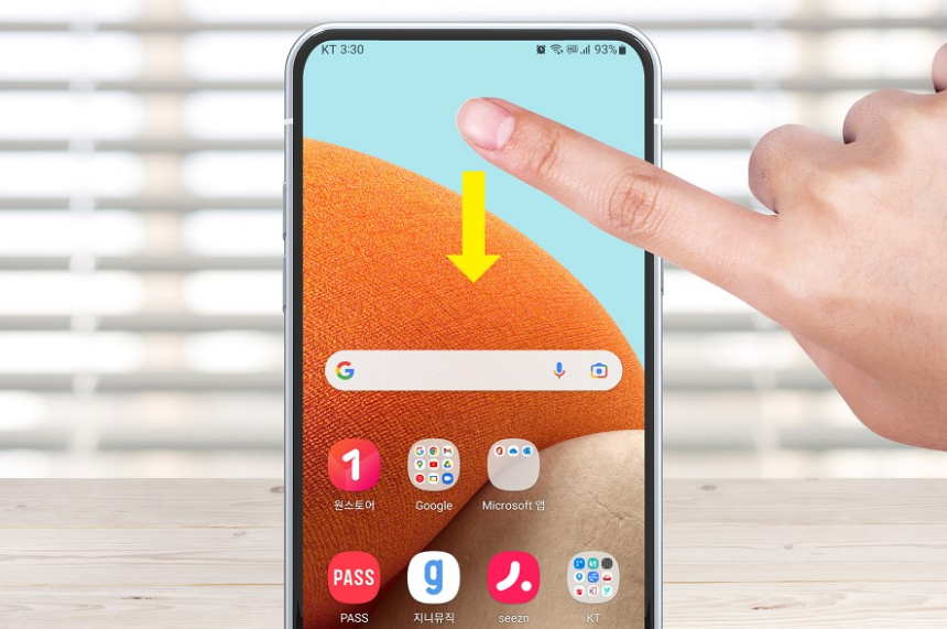 손전등 앱을 실행하기 위해 홈 화면에서 아무 곳이나 터치 후 손가락을 떼지 말고 밑으로 내려 주세요.