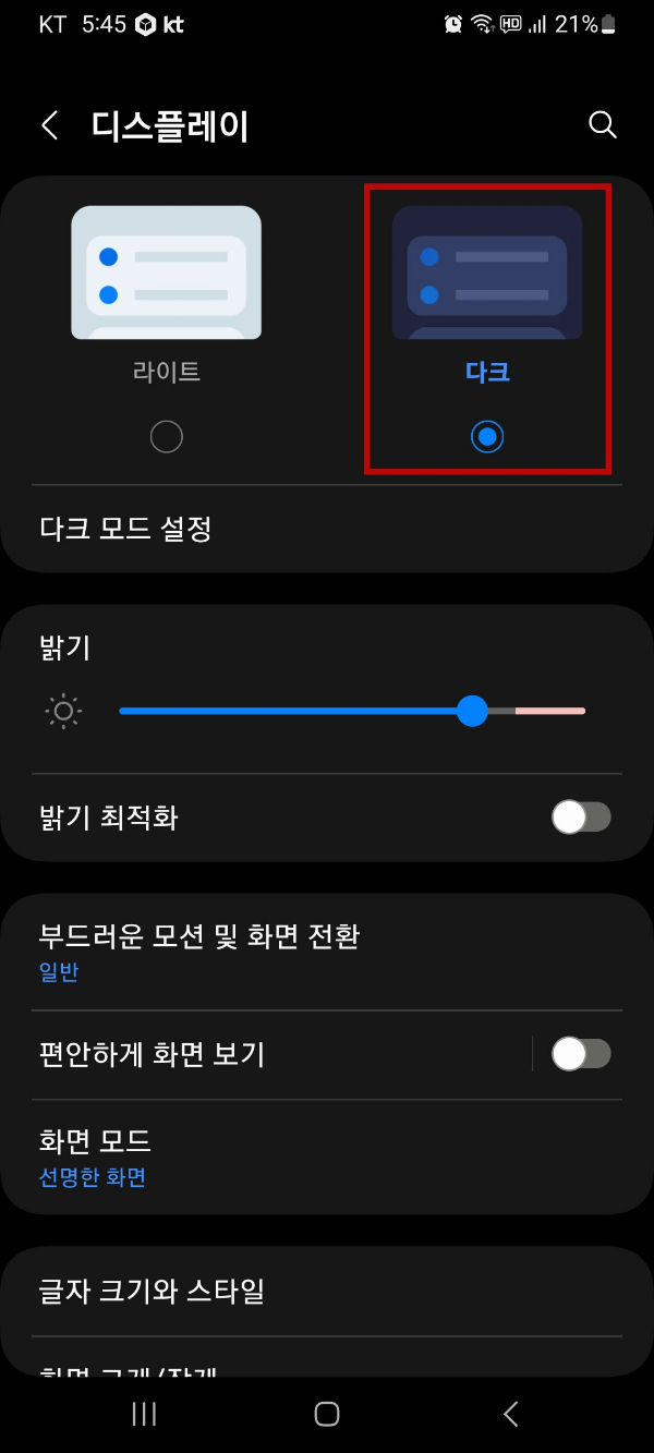 갤럭시 폰에는 다크 모드와 편안하게 화면 보기 모드가 있습니다. 먼저 다크 모드에 대해 알아보겠습니다.