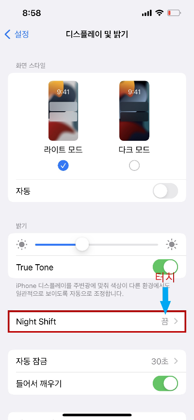 라이트와 다크 모드 설정화면에서 밑으로 내려오면 <Night Shift>가 끔으로 되어있는데 이것을 터치하여 실행해 주면 아이폰의 블루라이트 차단 설정이 완료됩니다.