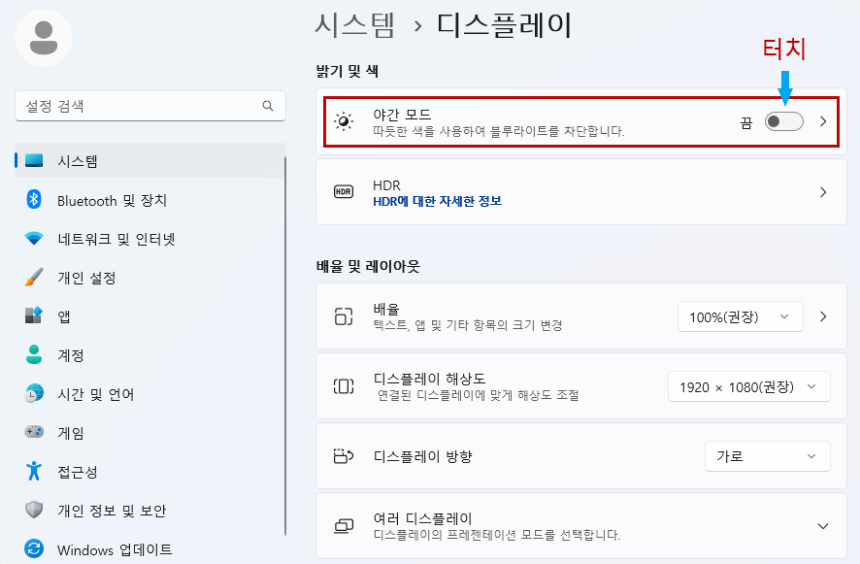 야간 모드가 <끔>으로 되어 있는데 클릭하여 <켬>으로 바꿔 주세요. 모니터 화면이 약간 누렇게 변하면 블루 라이트 차단 기능이 실행된 것입니다. 따뜻한 색은 화면을 보는 동안 눈의 피로를 줄이고 눈을 편안하게 해 준다고 하네요. 그래서 화면이 누렇게 보이는 것 같습니다.