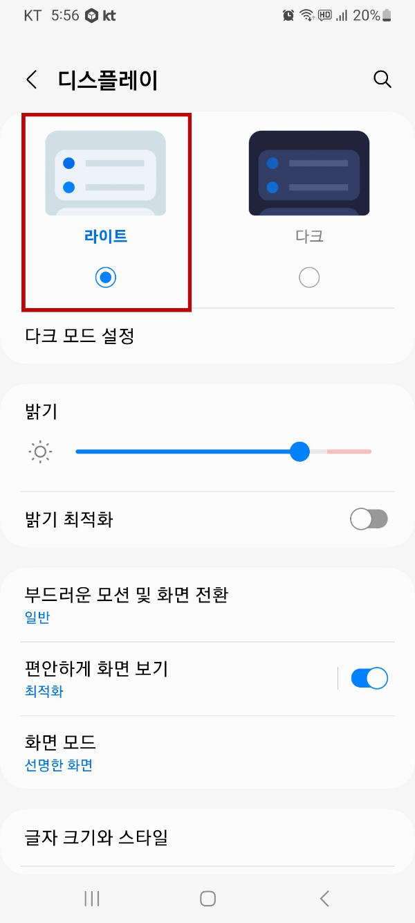 갤럭시 폰과 마찬가지로 화면 상단의 <다크 모드>를 선택해 주면 화면이 검게 변해 눈부심이 줄어듭니다.
