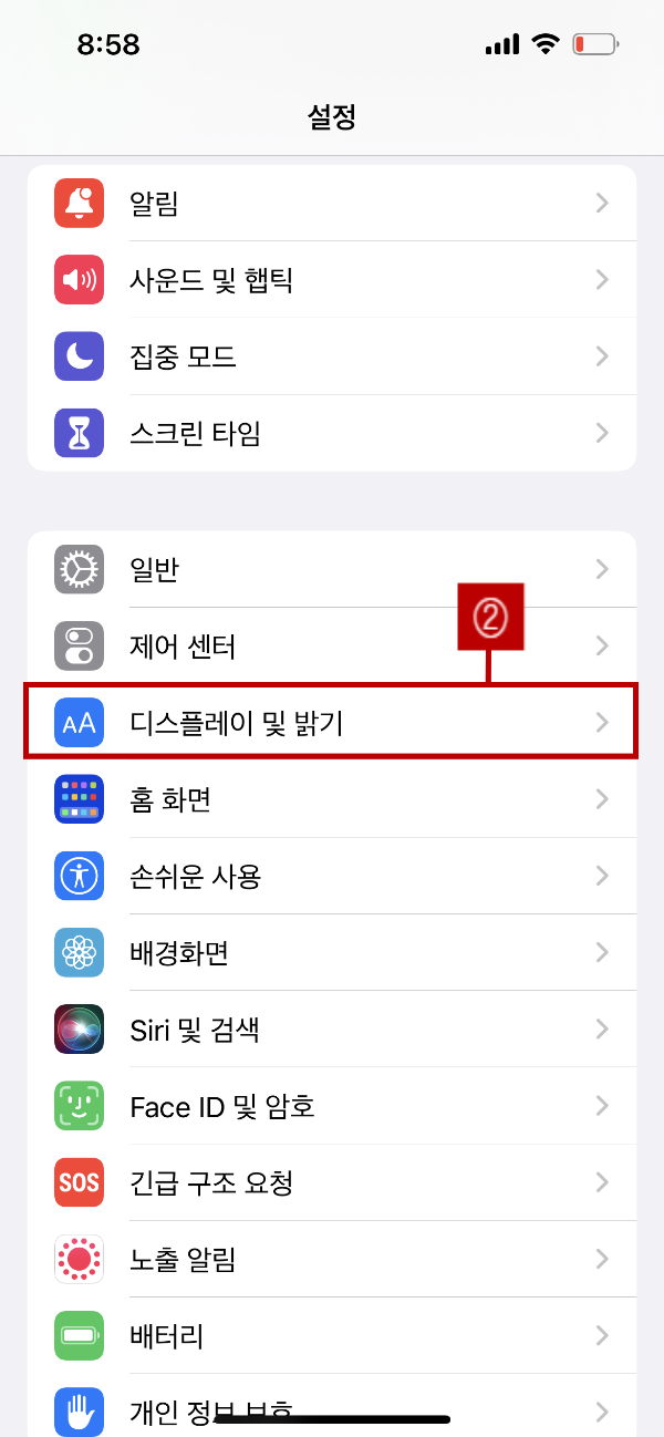 <설정 앱>을 실행한 후 <디스플레이 및 밝기>를 터치해 주세요.