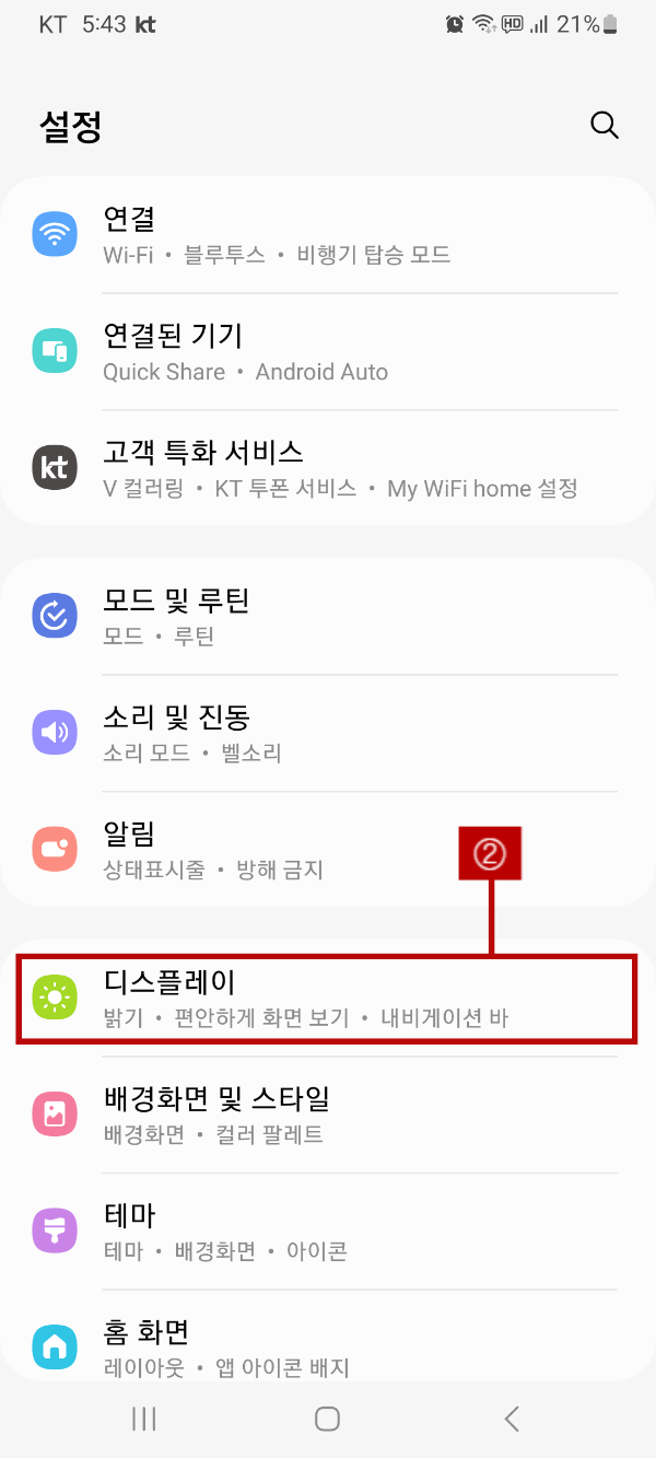 다크 모드를 설정하가 위해서 <설정 앱>을 실행한 후 <디스플레이>를 터치하여 주세요.