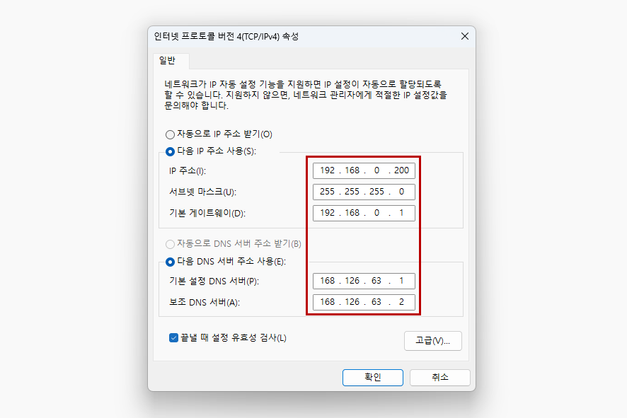 제 컴퓨터의 IPv4 주소는 192.168.0.2인데 맨 끝에 2대신 2~254중 한 개의 숫자를 선택해 입력하여 줍니다. 저는 2대신 200을 입력하였습니다. ( IPv4 = IP 주소 = 192.168.0.200) 아래와 같이 입력하고 확인을 누르면 고정 IP 설정이 모두 완료!!