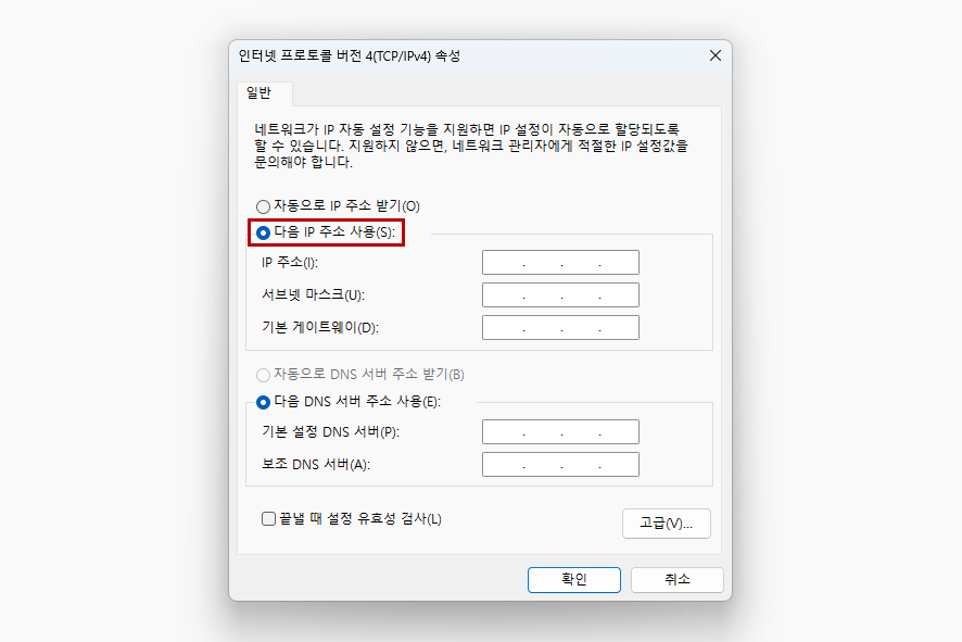 7. 인터넷 프로토콜 버전 4(TCP/IPv4) 속성창에서 <다음 IP 주소 사용>을 클릭해 주세요.
